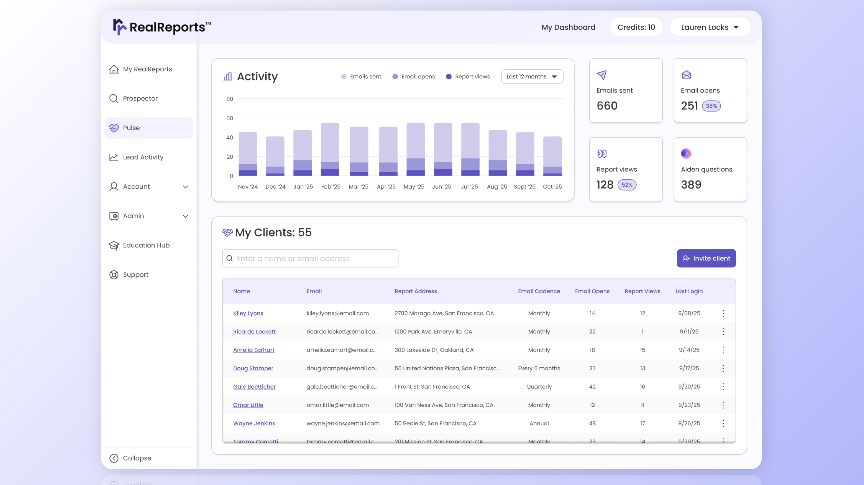 Because Pulse is directly integrated into the RealReports ecosystem, it offers far more than simple open/click signals. Each Pulse update includes a full RealReport which provides homeowners with comprehensive data on their property and the ability to interact with Aiden, RealReports’ AI property advisor. Agents gain real-time visibility into what those homeowners are asking Aiden about their property. That context can reveal intent, help plan outreach, and turn passive contacts into active leads.