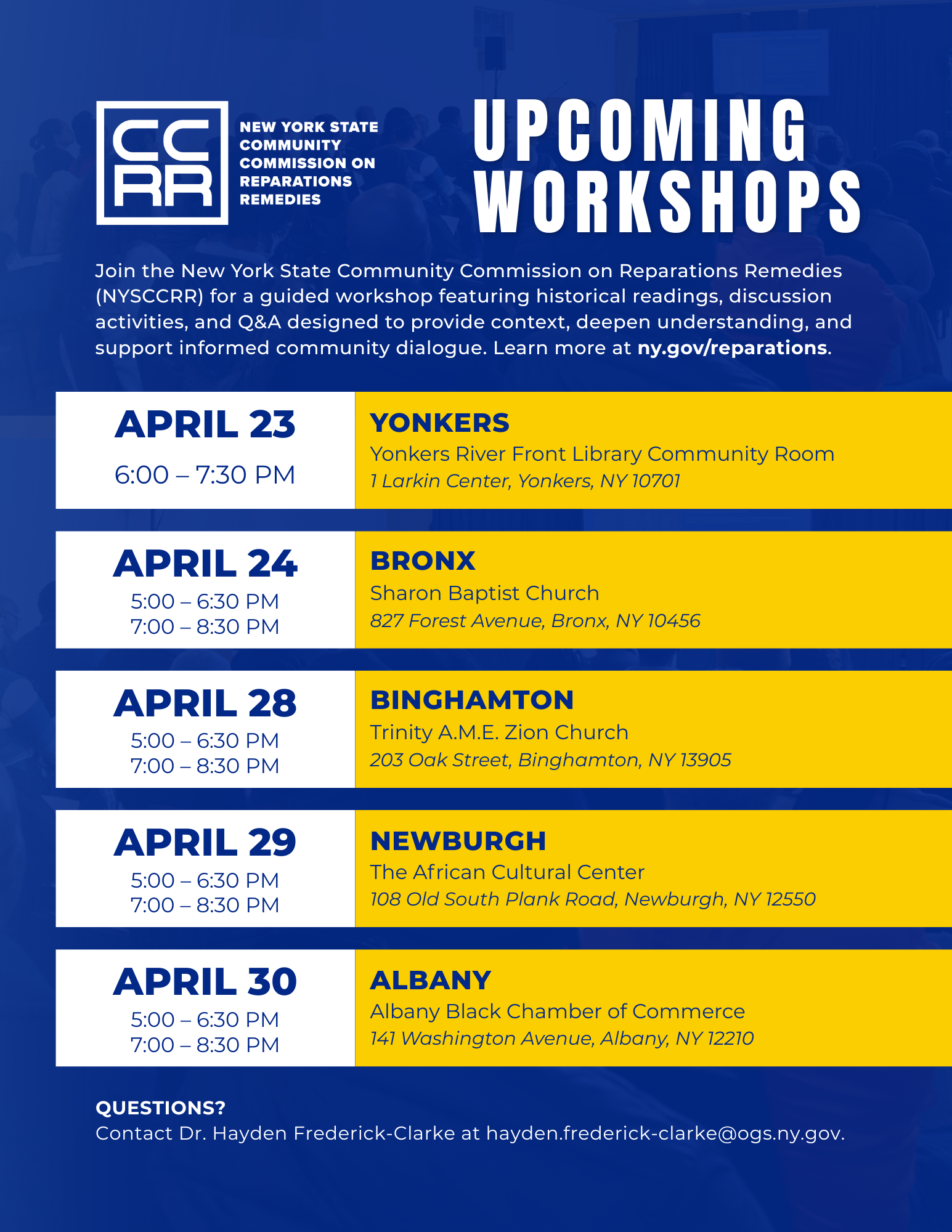 For more information, visit ny.gov/reparations or contact Dr. Hayden Frederick-Clarke at hayden.frederick-clarke@ogs.ny.gov.
